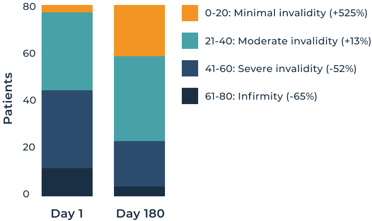 We observe improvements in 79,8% of patients, with an average disability score decrease of 31%.