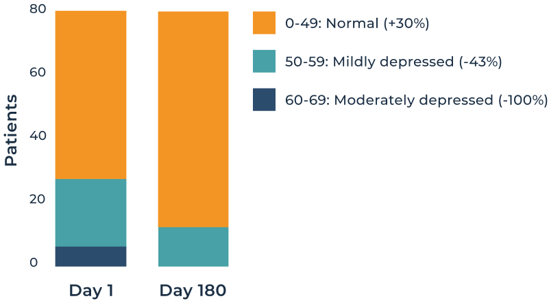 The Zung score exhibited a remarkable reduction, shifting from an average of 45.6% on day 1 to an average of 36.2% on day 180 (t(78) = 7.5, p < 0.0001).